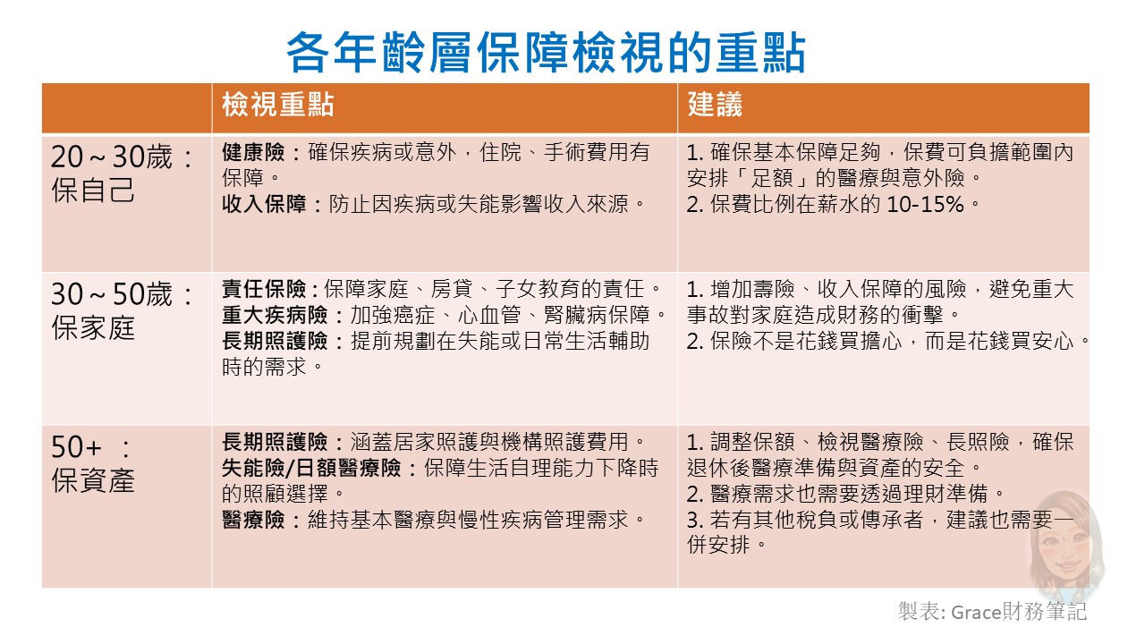 2.人生不同階段檢視:隨著目標、責任、健康狀況的不同,調整保障的需求。