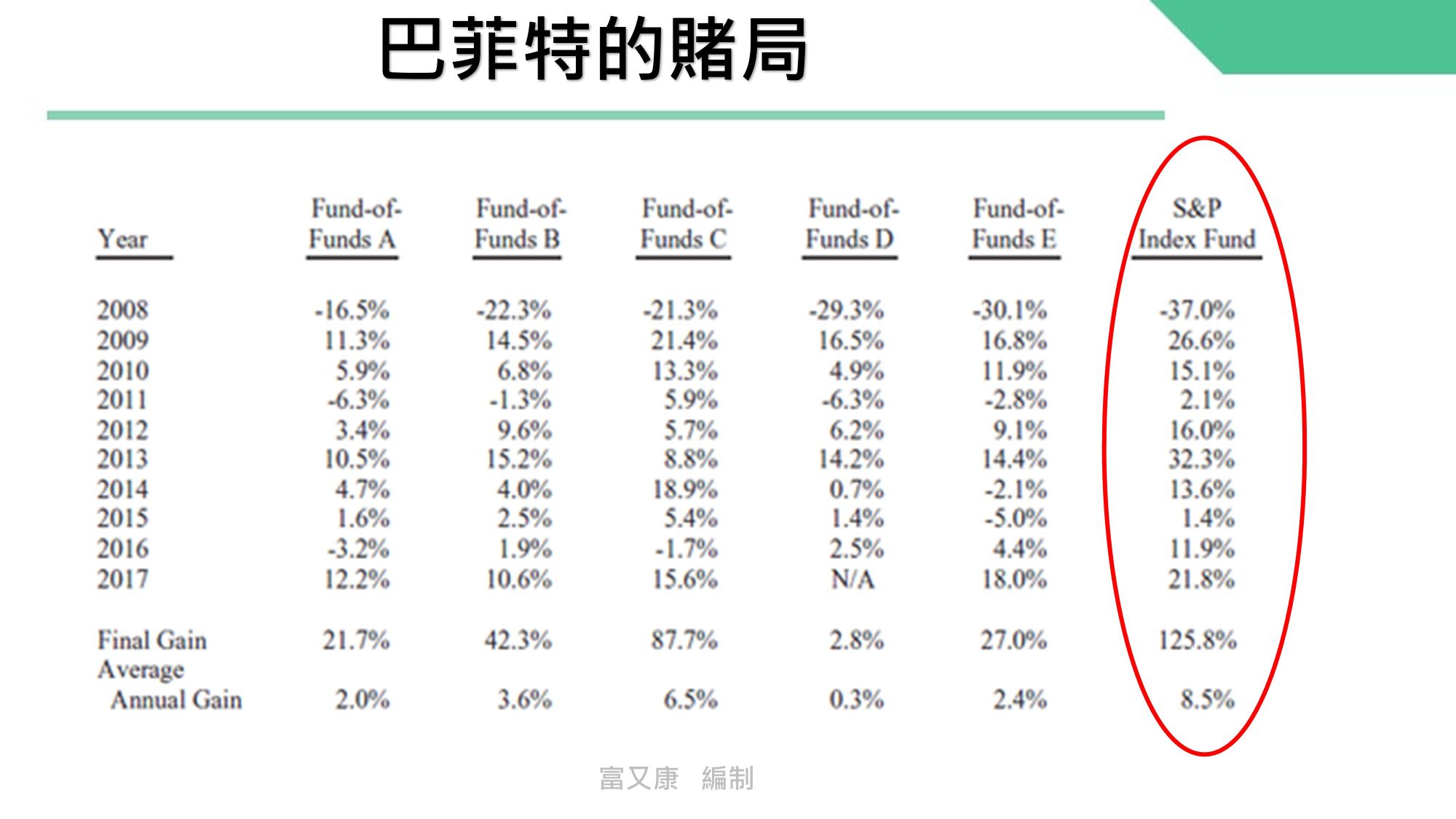 巴菲特曾公開打賭,他認為在十年期間(2008-2017),一個完全不用大腦、只追蹤美國市場表現的低成本 S&P 500 指數型基金,其績效將會勝過由專家團隊精挑細選、主動管理的五支組合式基金 (funds-of-funds)。