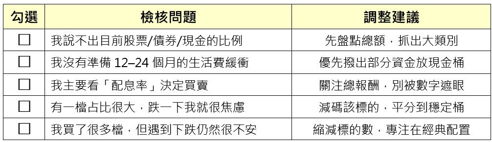 請幫自己的投資帳戶勾選看看,如果符合越多項,代表您該做的是「調整配置」,而不是「增加檔數」: